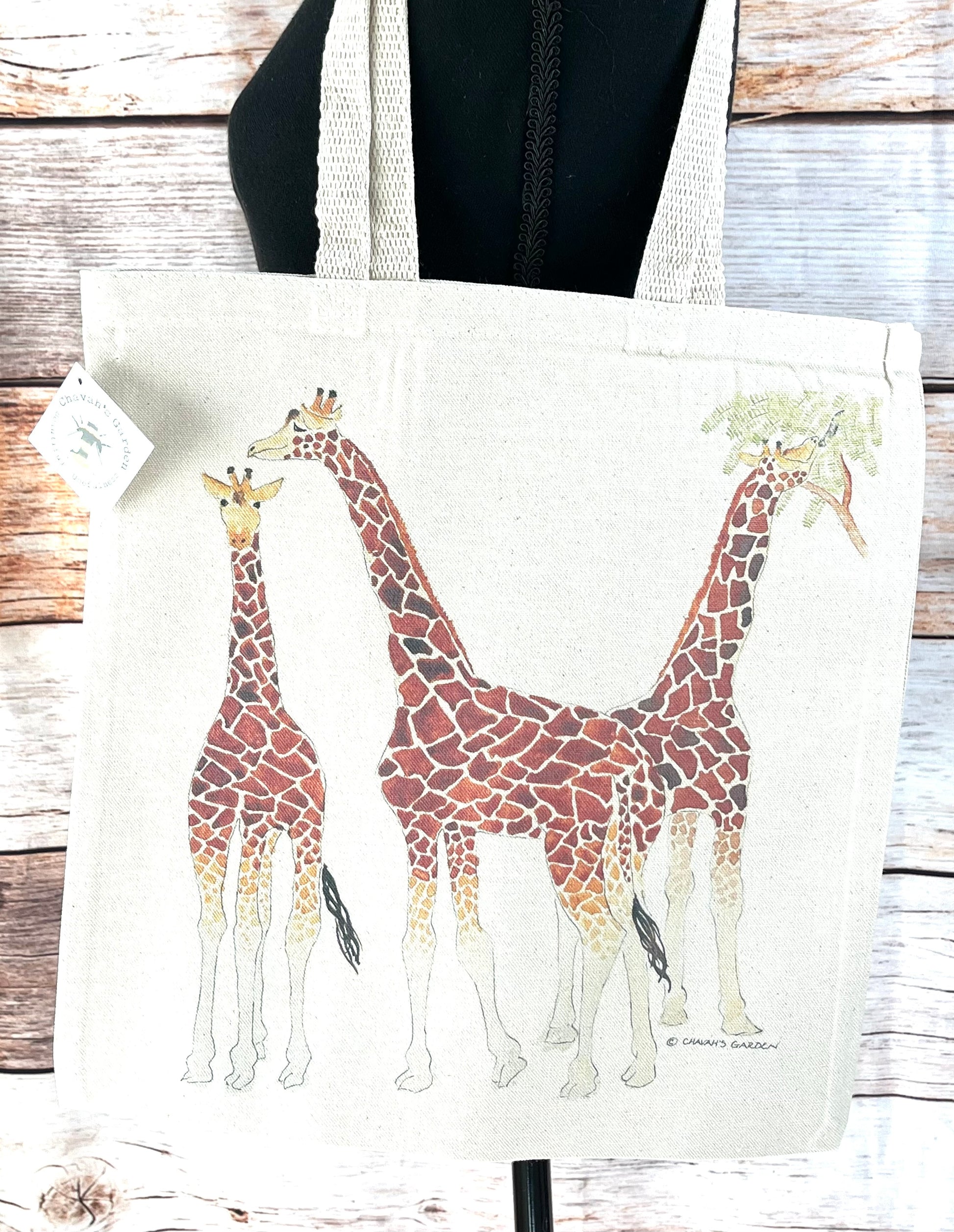 These tote bags are 100% cotton canvas. The handles are a soft thick woven cotton. Colorfast and washable (but I wouldn't put them in the dryer. Dryers always do bad things to bags.)