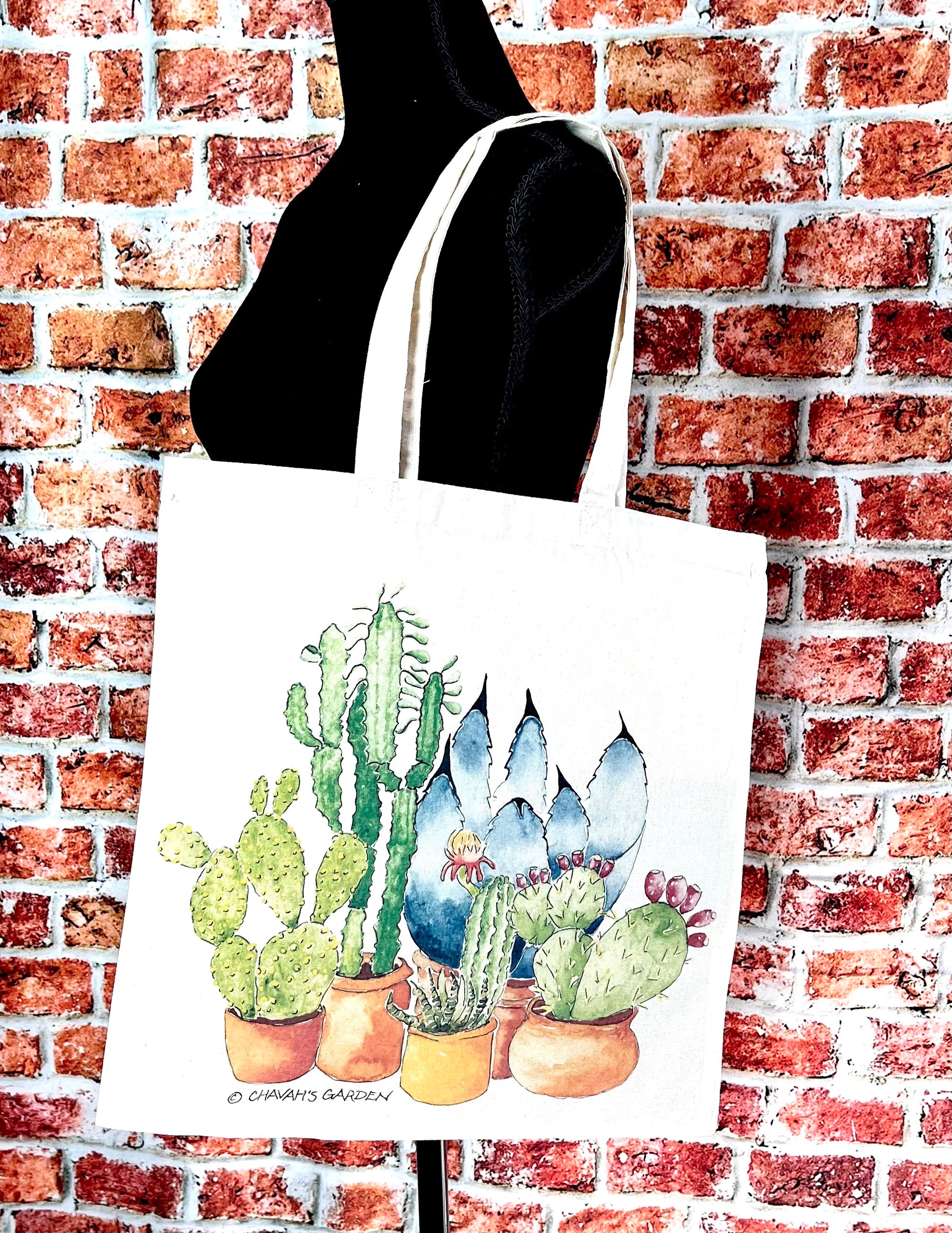 These tote bags are 100% cotton, lightweight canvas. The handles are a soft thick woven cotton. Colorfast and washable (but I wouldn't put them in the dryer. Dryers always do bad things to bags.)